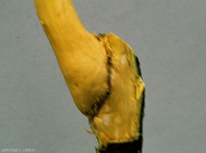 Les plants dépérissent assez rapidement. On note également quelques balafres ou cannelures dans le bois du scion, indiquant que le virus a été répliqué avant d’être neutralisé.