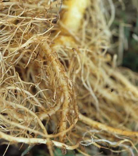 • Contextes d'expression : ces symptômes peuvent être observés à la suite d'une mauvaise utilisation d'engrais azotés ou d'un activateur de décomposition de la matière organique. Les lésions racinaires peuvent être généralisées ou localisées à la zone du système racinaire correspondant à l'emplacement de l'engrais. Sols frais, compactés, gorgés d'eau,  nitrification trop lente, pH du sol trop acide, fertilisation trop importante, etc.