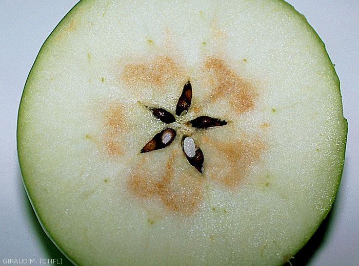 Symptômes uniquement interne, montrant à la coupe une coloration rose de la zone carpellaire, évoluant vers le brun (figures 1 et 2). Aucun symptôme extérieur visible.