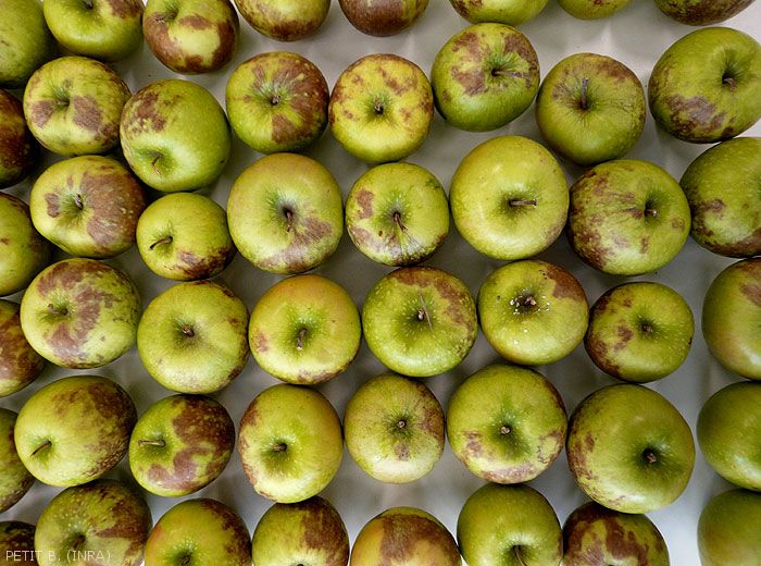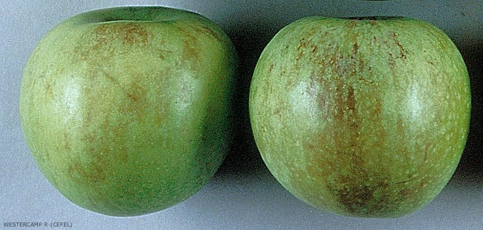 Brunissement superficiel, en plages diffuses (figure 1 à 5), plus facilement observable sur les parties peu colorées du fruit et pouvant devenir d’aspect rugueux. La chair sous l’épiderme n’est pas affectée (figure 6). L'apparition des symptômes a lieu en général à partir de décembre en froid normal, février en atmosphère contrôlée; les symptômes s’accentuent après sortie d’entreposage (figures 7 à 9) à température ambiante.