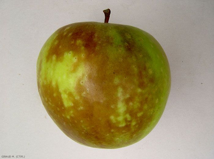 Brunissement superficiel plus ou moins foncé, à contours irréguliers et mal définis, souvent dans la partie oculaire du fruit (figures 1 à 3); il peut évoluer vers une légère dépression, d’aspect granuleux (figures 4). Les symptômes apparaissent après une conservation de moyenne à longue durée. Cette maladie peut prendre une forme lenticellaire chez certaines variétés (Delicious Rouge).