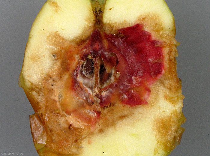 Développement de mycélium blanchâtre à rosé en surface ou dans les cavités internes.