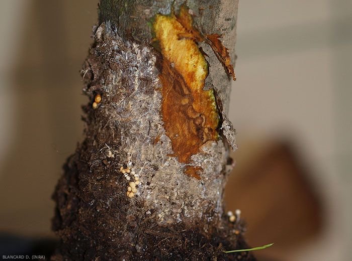 NB : Il n’y a pas de risque de confusion avec l’Armillaire où le mycélium est sous cortical, ni avec le Phytophthora, où il n’y a pas de mycélium blanc mais une nécrose noire.
