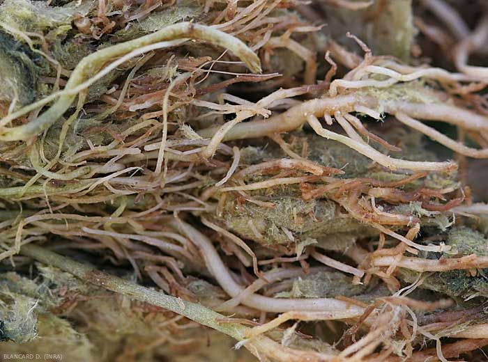 - brunissement et pourriture racinaire, décomposition du cortex (figures 1 et 2) ;
