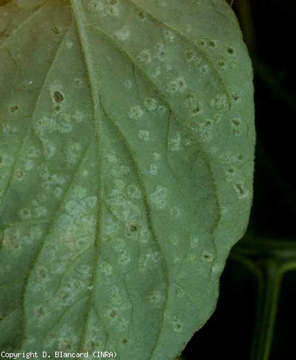 - taches chlorotiques plus ou moins réparties sur le limbe à proximité des nervures (figures 1 et 2) ;
