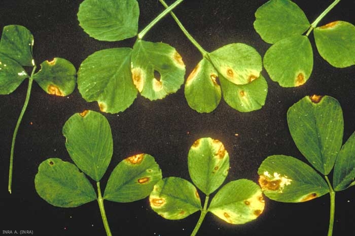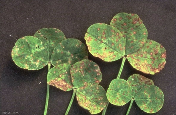 Sur trèfle violet, la maladie des taches communes est aussi très fréquente. Causée par le champignon Pseudopziza trifolii, elle est caractérisée par la formation de petites taches jaunes sans halo sur les feuilles (figures). Cette maladie comme la stemphiliose (figure) induit la synthèse de coumestrol, analogue d'oestrogène toxique pour les animaux.