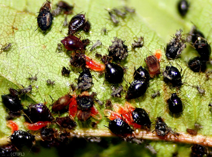 - contre le pou rouge de Californie : lâchers de 50 000-100 000 insectes/ha par an en 4-5 fois (environ un par mois) sur les arbres atteints,