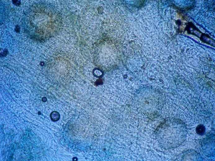 - Minuscules et nombreuses masses globuleuses brunes à noires, qui persillent les lésions, ce sont les fructifications visibles à la loupe de ce champignon ;
