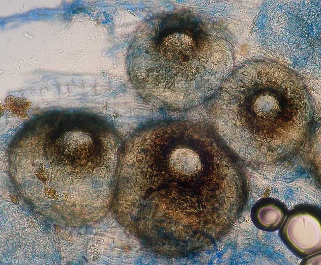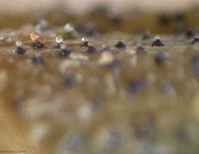 - Des pycnides formant des pycniospores bicellulaires et sortant de ces fructifications sous la forme de cirrhes mucilagineux jaunâtres ;