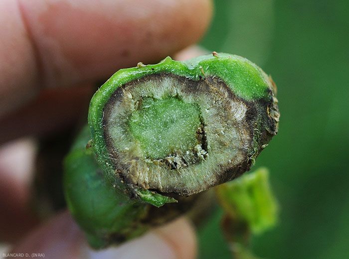 Niveau de difficulté d'observation des signes sur les organes affectés : +/- (sur collet et fruits) (faire une chambre humide)