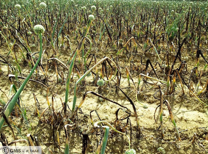 Plusieurs contaminations peuvent avoir lieu au cours du cycle de l’oignon porte-graine. La maladie évolue et aboutit à une épidémie destructrice après 3 – 4 cycles d’attaque consécutifs.
