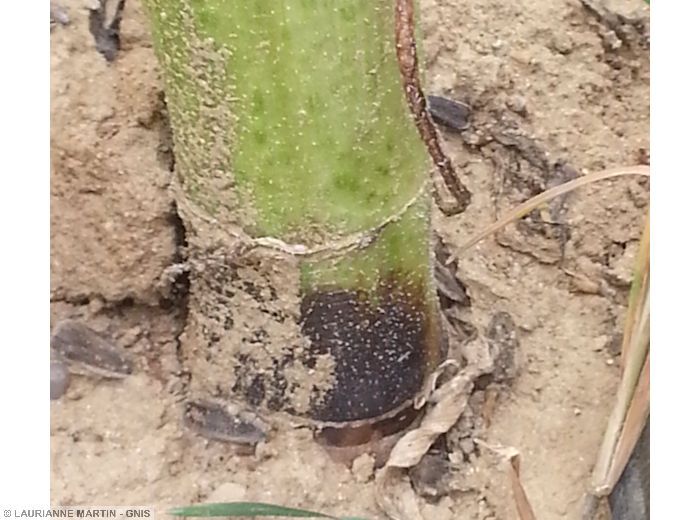 Sur tiges : taches noires aux contours nets, arrondies et centrées sur le pétiole des feuilles (symptôme caractéristique), pouvant entrainer un noircissement complet de la tige.