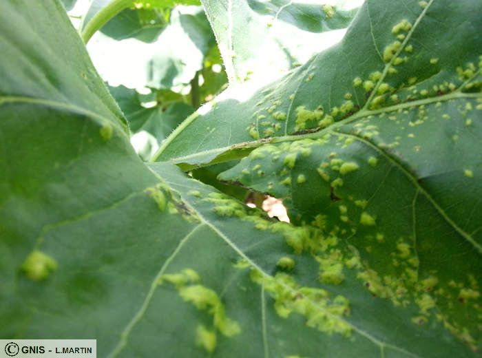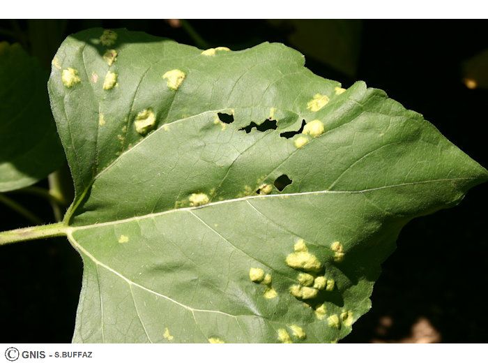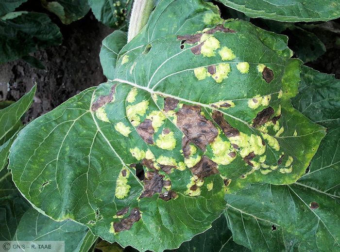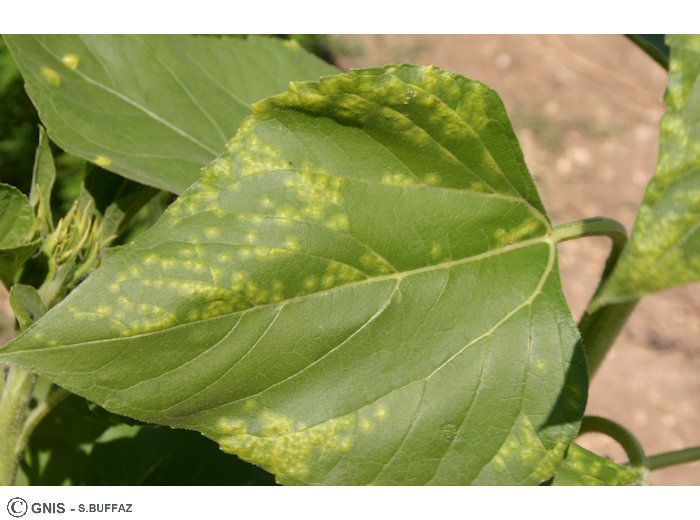 Des symptômes peuvent aussi se déclarer sur pétioles, tige et bractées du capitule, sous forme de taches superficielles vert glauque et d’un aspect huileux.