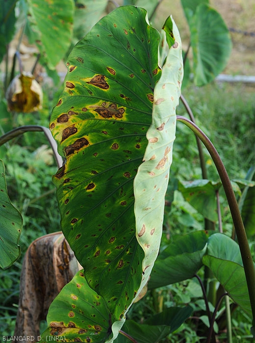 Signes: des fructifications du champignon parsement les lésions, leur conférant parfois une légère teinte gris sombre à noire (figure 7). Elles sont constituées de conidiophores simples , plus ou moins bruns, portant des conidies isolées ou en courtes chaînes, cylindriques, droites ou courbées, subhyalines à brun olivâtres, et cloisonnées (5-18 cloisons).