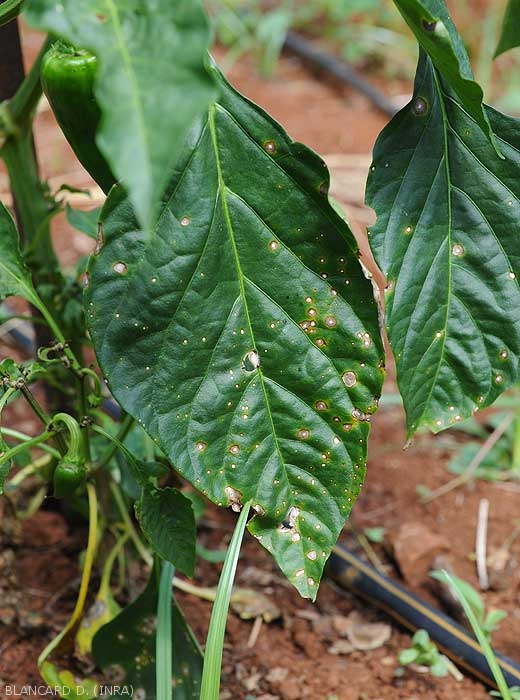 Les tissus dégradés sèchent, se fendent et finissent par tomber ; le limbe est ainsi partiellement criblé.