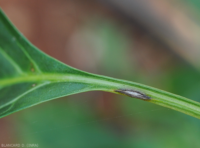 Des lésions comparables, mais allongées sont parfois visibles sur les pétioles (figure 4) et la tige.