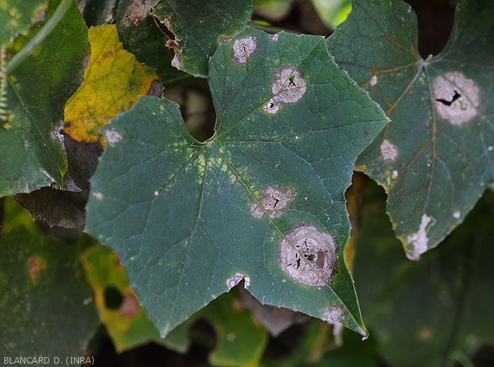 Les tissus dégradés sèchent, se fendent et finissent par tomber ; le limbe est plus ou moins troué (figures 7 à 11).