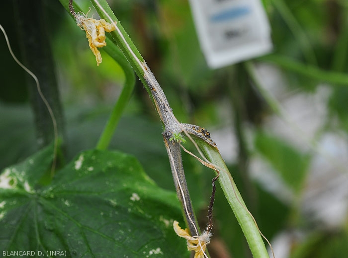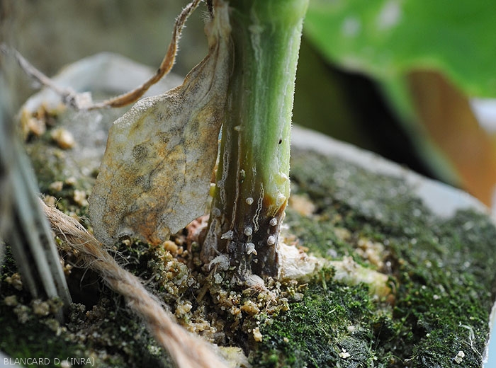Lésions d'abord humides et vert sombre sur tiges (parties aériennes -figure 4- et collet -figures 5 à 7-), brunissant et se nécrosant progressivement. Des exsudats gommeux brun rougeâtres à noirs sur celles-ci (figures 7 et 8). Ces lésions s'initient bien souvent à partir de plaies de taille, de greffage ou de tissus sénescents présents sur la tige et couvrent des portions importantes de tiges.