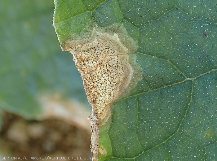 Taches huileuses à livides sur feuilles. De forme plutôt circulaire, elles s'étendent en évoluant, prennent une teinte brune, se nécrosent et se dessèchent. Notons qu'elles sont souvent localisées en bordure du limbe, et qu'un halo jaune les ceinture parfois (figures 1 à 3).