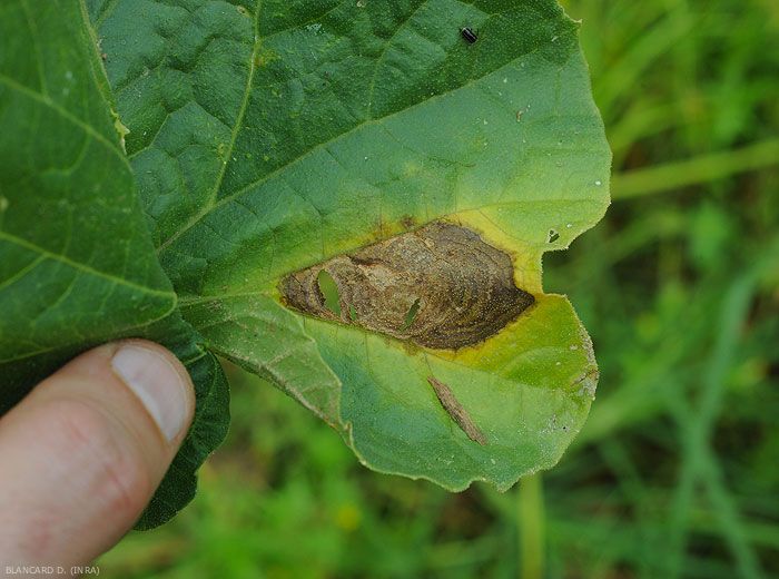 Taches sur feuilles huileuses à livides. De forme plutôt circulaire, elles s'étendent en évoluant, prennent une teinte brune, se nécrosent et se dessèchent. Notons qu'elles peuvent être localisées en bordure du limbe dans un premier temps, et qu'un halo jaune les ceinture parfois.
