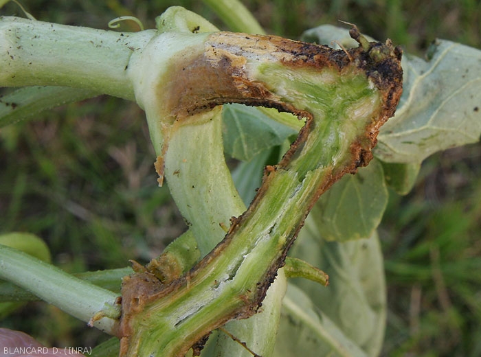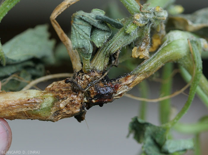 Lésions d'abord humides et vert sombre sur tiges (parties aériennes et collet), brunissant et se nécrosant progressivement (figures 1 à 5). Elles s'initient bien souvent à partir de plaies de taille, de greffage ou de tissus sénescents présents sur la tige et couvrent des portions importantes de tiges.