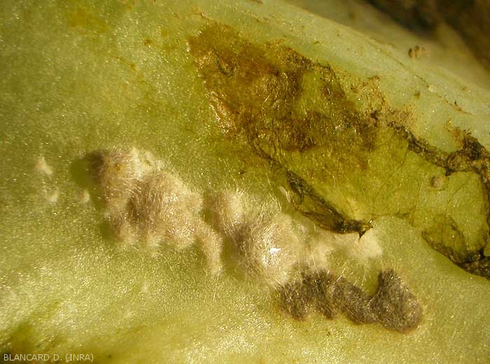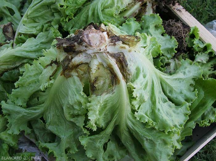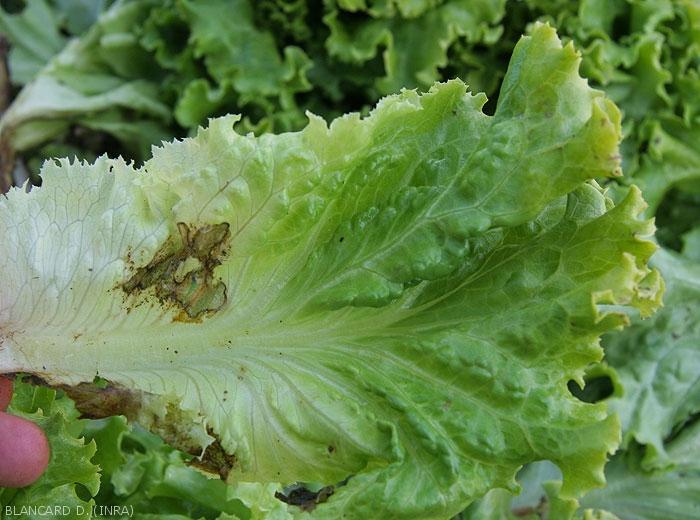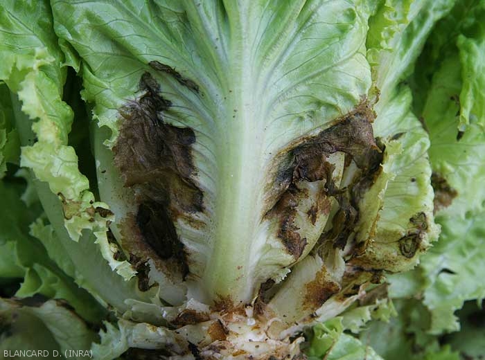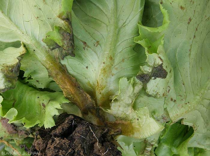 Lésions brunes à noirâtres situées sur le limbe respectant momentanément la nervure principale (figures 3 à 4). Elles s'étendent rapidement et une pourriture plus ou moins humide se met en place (figure 5). Par la suite, elle gagne les feuilles du coeur et parfois même la tige. Le collet peut être ultérieurement ceinturé.