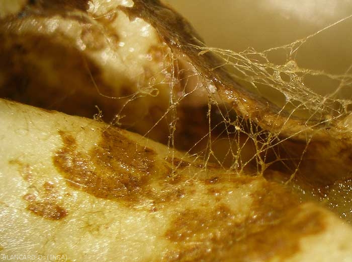 Nombreuses altérations rougeâtres à brunes apparaissant à la fois sur les pétioles, la nervure principale et sur le limbe des feuilles basses (figure 6). Sur ce dernier, leur évolution semble plus rapide et les tissus donnent l'impression de "fondre".