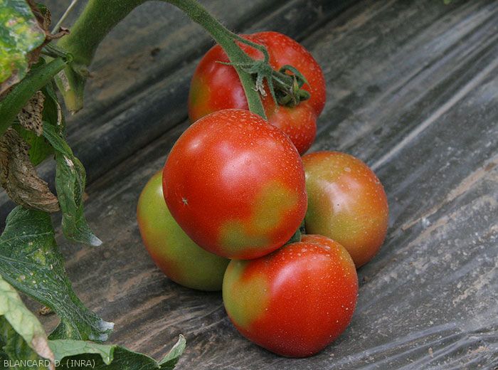 • Les piqûres des larves du biotype B de Bemisia tabaci entrainent des désordres physiologiques sur certaines cultures (argenture de la courgette (figure 14) et autres Cucurbita, mauvaise maturation de la tomate (figure 15).