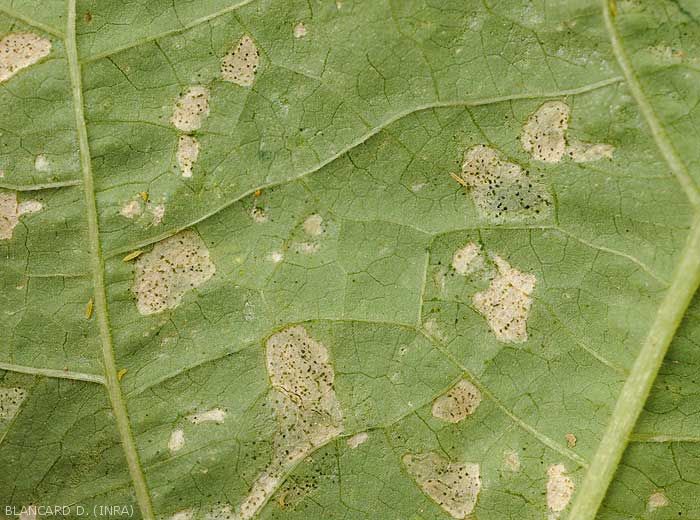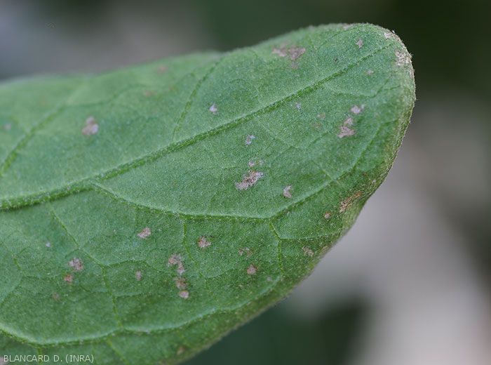 - Nombreuses et minuscules lésions argentées, voire des plages de taille et de forme irrégulières apparaissent sur le limbe (figure ) ; elles se nécrosent progressivement et prennent une teinte beigeâtre.