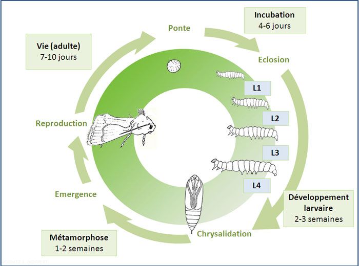 - Cycle de développement : comprend 4 phases de développement : œuf, larve ou chenille, nymphe ou chrysalide, et papillon (figures ). La plupart de ces insectes hibernent par l'intermédiaire des chrysalides, voire des larves, bien que les autres stades de développement puissent contribuer à la conservation hivernale de ces insectes. Ils peuvent être hébergés par de nombreux hôtes cultivés ou non.