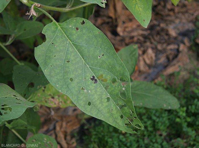 - Consommation des apex et des feuilles et folioles par les larves, notamment les plus âgées. Elles forment de larges trous situées sur le limbe ou à sa périphérie, ne laissant parfois derrière elles que les nervures principales et réduisant ainsi fortement la photosynthèse.