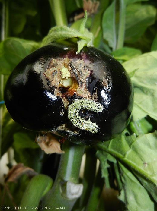 - Perforation des tiges et des fruits qu'elles envahissent par la suite. En plus des perforations, des galeries et de cavités sont observées. De nombreuses déjections sont visibles à l'intérieur et aussi à l'extérieur. Les fruits parasités par exemple de tomate cessent de grossir, mûrissent prématurément et tombent. Soulignons que ces perforations facilitent la pénétration de nombreux agents de pourritures, comme Choanephora cucurbitacearum, etc.