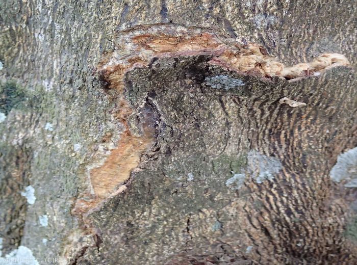 - Si attaque des racines, le dépérissement de l'arbre ou du jeune plant se produit alors de façon généralisée sans exsudation de gomme.