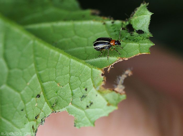 - Feuilles dévorées principalement par les adultes qui se nourrissent du limbe. Celui-ci est découpé, troué plus ou moins régulièrement, les nervures restant en place parfois et conférant aux feuilles l'aspect de dentelles.