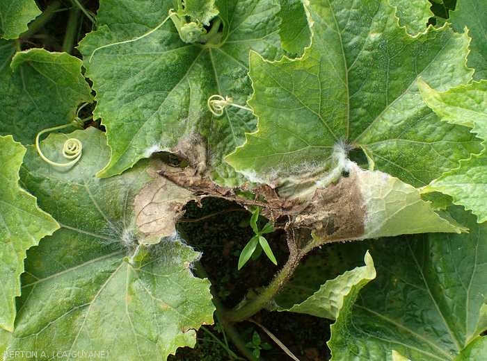 Symptômes de Rhizoctone foliaire sur Cucurbitacées
