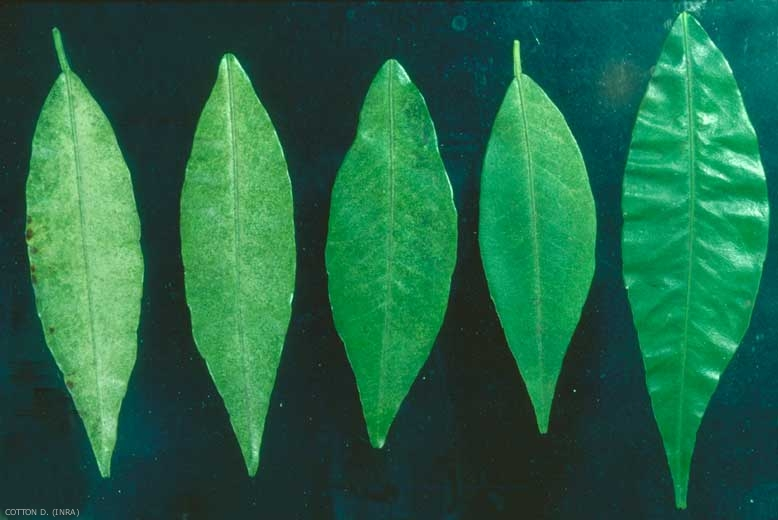 - Feuilles : décoloration du feuillage avec la présence de plusieurs points décolorés, ainsi qu'un aspect « plombé ».