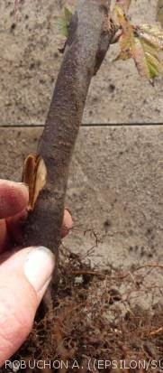 • Coupure de sève à partir de la base du scion, même lorsque l'écorce est encore verte. L'écorce reste attachée au bois.