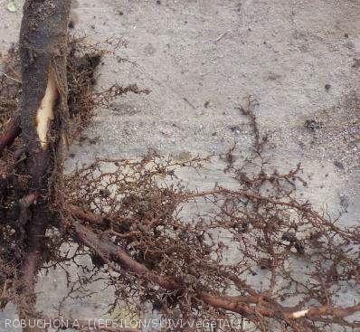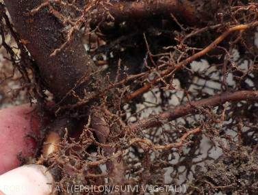 • Système racinaire moindre sur plante à symptômes.