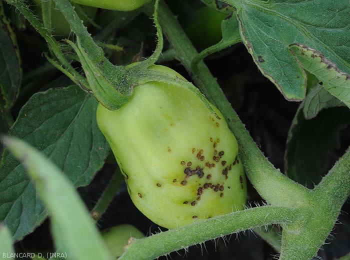 Lésions graisseuses, de couleur vert sombre à noire sur fruits verts donnant lieu à des pustules liégeuses en relief, craquelées, pouvant atteindre 1 cm de diamètre. Un halo graisseux les entoure parfois (figure 4).