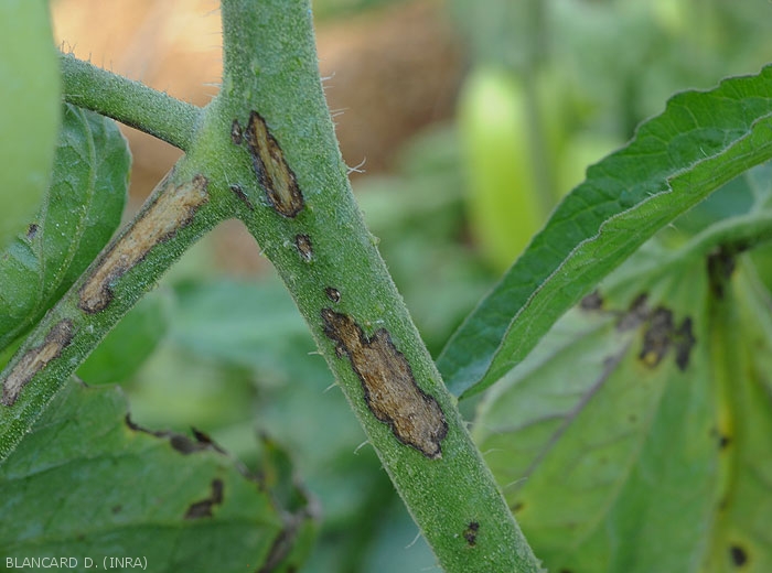 Lésions comparables mais souvent plus étendues sur pétioles, tige, pédoncules (figure 3) et sépales.