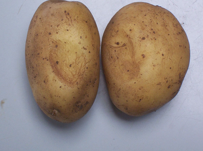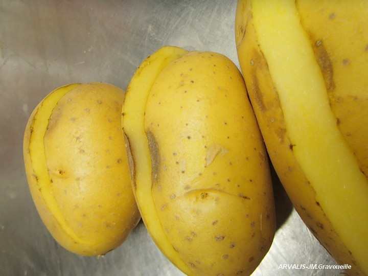 Les tubercules présentent en surface des zones planes, plus ou moins marquées et étendues, accompagnées ou non d’un flétrissement et d’un aspect terne de la peau (Figures 1 à 4). À ce niveau, celle-ci peut présenter une lésion, le plus souvent assez superficielle et de dimension limitée. Dans les cas les plus graves d’aplatissement des tubercules et après une conservation de longue durée, un symptôme de type noircissement interne peut apparaître dans les tissus sous-jacents dans les heures suivant leur déstockage.