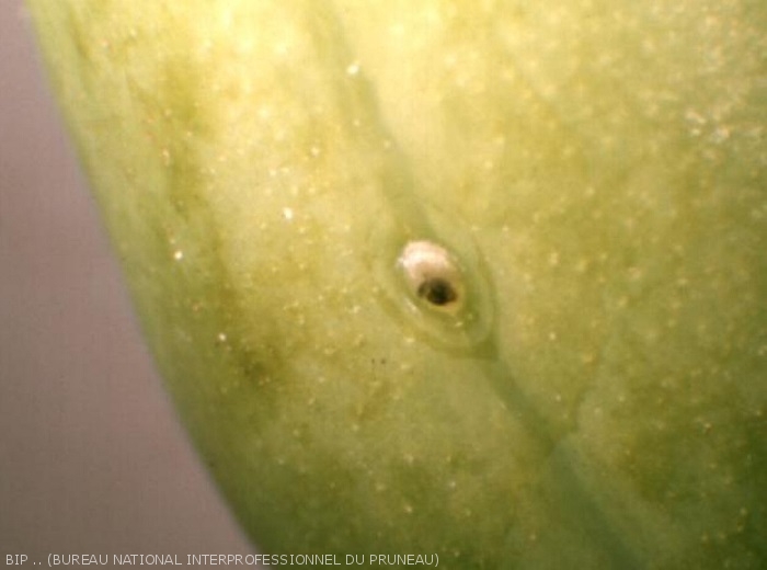 Les fruits attaqués présentent des galeries superficielles. Des écoulements gommeux caractéristiques peuvent alors être observés. Ils correspondent à une défense naturelle des fruits. Avec un peu d'attention, et à l'aide d'une loupe, il est possible d'observer une trace d'oeuf à proximité de la perforation.