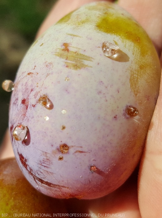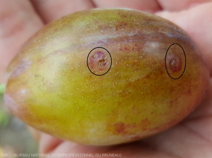 Les fruits attaqués présentent des perforations en forme de spirale. Des écoulements gommeux caractéristiques peuvent alors être observés. Ils correspondent à une défense naturelle des fruits. Avec un peu d'attention, et à l'aide d'une loupe, il est possible d'observer une ou des traces d'oeufs à proximité de la perforation.