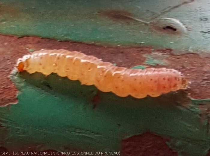 - la larve est rose vif pour carpocapse, et gris jaune à rose pâle, avec des points gris foncé (appelés pinaculum) pour petite tordeuse.