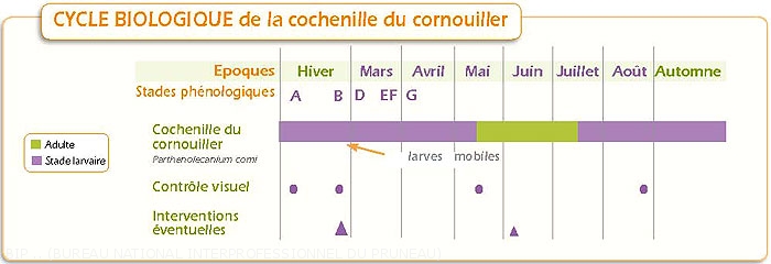 - Sur les vergers de prunier d'Ente, la cochenille du cornouiller est souvent "accompagnée" de la cochenille du poirier (voire du pou de san josé). Les périodes d'essaimage, de migration - lorsque les larves ne sont pas protégées par les boucliers - diffèrent d'une espèce de cochenille à l'autre. En présence avérée de plusieurs espèces de cochenilles, il est préférable d'opter pour une solution systémique, capable d'atteindre les insectes sous leur bouclier. Dans ce cas, la période d'intervention idéale se situera sur la deuxième quinzaine de mai, lorsque la végétation est poussante et que la sève circule activement dans l'arbre.