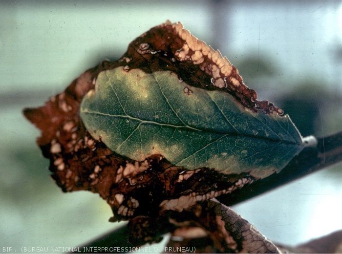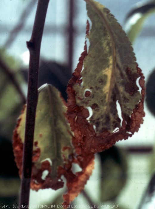 Les nécroses du bord de la feuille s'aggravent. Des plages jaunissantes apparaissent entre les nervures. Les symptômes peuvent parfois être plus marqués avec des zones décolorées et nécrotiques sur l'ensemble du limbe.