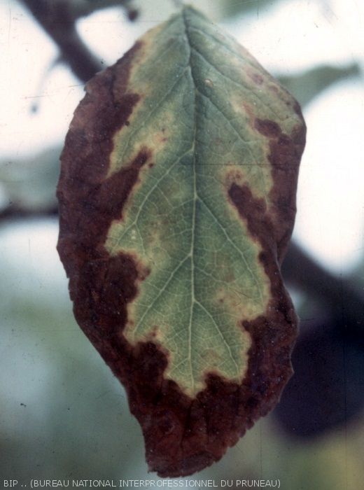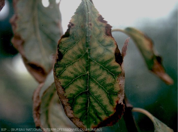A partir du mois de juillet apparaît un dessèchement du bord de la feuille. Les plages nécrotiques gagnent vers l’intérieur du limbe entre les nervures principales, avec décoloration des zones non desséchées. Les premières feuilles atteintes, sont celles du milieu ou de la base des rameaux, les symptômes gagnent ensuite vers le haut et le bas. Les symptômes vont en se multipliant à mesure que la saison s’avance.