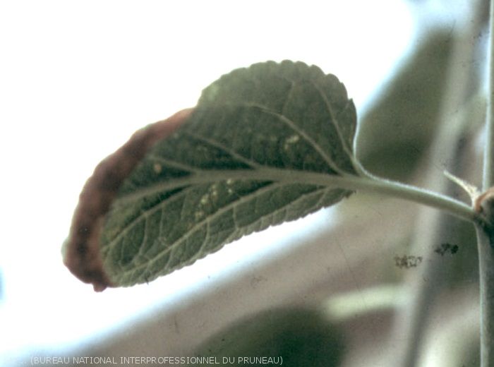 En été, les jeunes feuilles du sommet des rameaux peuvent également présenter des symptômes. Elles sont plus petites et plus arrondies que la normale. Elles se creusent. La pointe du limbe jaunit et se nécrose.