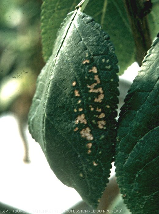 En fin de saison, sur jeunes feuilles, des nécroses internervaires symétriques peuvent être visibles. Toutes les taches nécrosées peuvent tomber et donner aux feuilles un aspect criblé. Ces criblures ont alors une forme arrondie mais irrégulière.