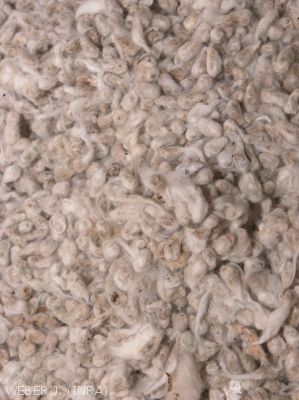 La récolte a lieu 6 à 7 mois après le semis et les fibres sont séparées des graines (égrenage). Les fibres sont rassemblées en balles pour être traitées par l'industrie textile.